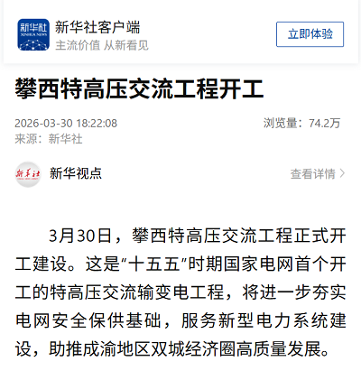 3月30日,攀西特高压交流工程正式开工建设。这是“十五五”时期国家电网首个开工的特高压交流输变电工程,将进一步夯实电网安全保供基础,服务新型电力系统建设,助推成渝地区双城经济圈高质量发展。 攀西特高压交流工程总投资约232亿元,途经凉山、宜宾、乐山3市(州)12县(区),新建攀西、川南两座1000千伏变电站,扩建天府南1000千伏变电站,新建线路全长994公里。工程预计2028年建成投运,年最大输送电量约182亿千瓦时,相当于替代标煤约588万吨、减排二氧化碳约1446万吨。 攀西地区是我国西南重要清洁能源基地,也是“西电东送”关键送端。近年来,当地清洁能源装机规模已突破5000万千瓦,外送需求持续增长。这一工程建成后,将有效打通电力外送通道,显著增强攀西清洁能源向成都平原及川南负荷中心输送能力。 同时,工程投运后将通过天府南变电站与已建成的川渝1000千伏特高压交流工程联网,推动形成甘孜、阿坝、攀西三大清洁能源基地与成都平原、川南、川北三大负荷中心之间“三送三受”的电网格局,进一步提升电网资源优化配置能力和应对极端风险能力。