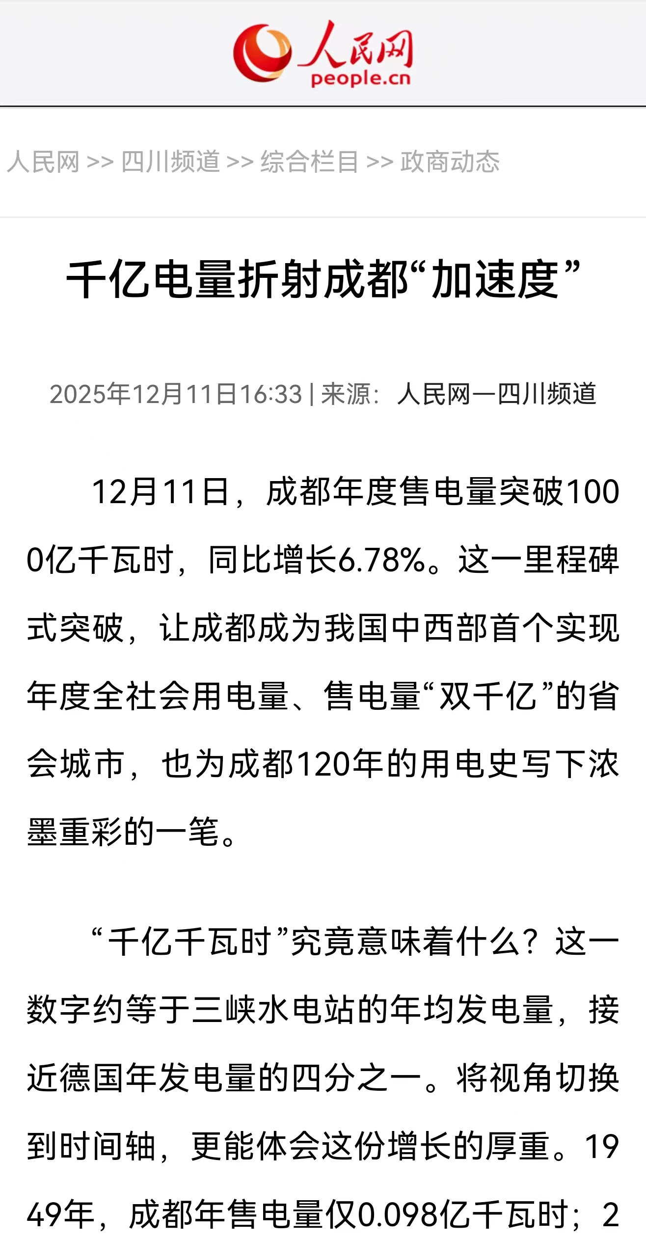 12月11日,成都年度售电量突破1000亿千瓦时,同比增长6.78%。这一里程碑式突破,让成都成为我国中西部首个实现年度全社会用电量、售电量“双千亿”的省会城市,也为成都120年的用电史写下浓墨重彩的一笔。 “千亿千瓦时”究竟意味着什么?这一数字约等于三峡水电站的年均发电量,接近德国年发电量的四分之一。将视角切换到时间轴,更能体会这份增长的厚重。1949年,成都年售电量仅0.098亿千瓦时;2001年,首次突破100亿千瓦时;2016年,迈过500亿千瓦时大关。 用电量,向来是经济运行的“晴雨表”与“风向标”。成都市统计局数据显示,2025年前三季度全市地区生产总值达18226.9亿元,按不变价格计算,同比增长5.8%。电量与经济的同步攀升,勾勒出城市发展的强劲曲线。 这份同频共振的动力源自何处?答案藏在产业升级的浪潮里,躲在新质生产力的壮大中,也融在市民绿色生活的日常里。从生产端的工业轰鸣到投资端的创新涌动,再到消费端的绿意盎然,千亿电量的背后,是一个立体鲜活、蓬勃向上的成都。 国网成都供电公司成华供电中心客户经理走访机器人制造企业,帮助企业提高供电可靠性。陈默摄 生产端:工业基本盘筑牢增长根基 12月10日,成都士兰半导体制造有限公司的生产车间内,LED半导体与集成电路芯片全自动生产线正满负荷运转,制造、封装、测试、包装等工序无缝衔接,一派火热景象。“今年生产线始终马力全开赶订单,交付量同比增长2倍,订单与交付指标屡创新高。”该公司相关负责人表示,正是电力的可靠保障,使企业总投资15亿元的扩产项目顺利投运,二期项目也加速落地,预计今年用电量同比增幅超37%。 士兰半导体的蓬勃发展,是成都万亿级产业集群崛起的一个缩影。回溯2020年,电子信息产业成为全市首个万亿级产业集群,高新技术产业营业收入突破1万亿元,千亿级产业集群增至8个。经过5年迭代升级,如今的成都已培育出电子信息、装备制造两大万亿级产业集群,以及人工智能、航空航天、软件和信息服务等11条千亿级重点产业链,产业发展从“单点突破”迈入“集团作战”的新阶段。 “十四五”时期,成都产业能级的提升,直接反映在用电数据的攀升上,电力能源消费的增长曲线与产业高质量发展的轨迹高度契合。全市工业用电量从2020年的317.6亿千瓦时稳步增至2025年的438亿千瓦时,5年间实现37.9% 的增长。 再看近期全市工业发展态势。今年以来,持续领跑的工业增长,成为拉动用电量突破千亿的核心动力。今年1至10月,成都规模以上工业增加值同比增长7.3%,37个大类行业中有25个行业增加值实现增长。其中,汽车制造业增长21.2%,电气机械和器材制造业增长11.7%,计算机、通信和其他电子设备制造业增长11.6%。 产业园区是工业增长的“承载地”,更是用电增长的“集聚区”。成都高新西区内,英特尔、京东方等国际巨头持续扩大产线规模,电子信息产业集聚成势,今年用电量同比增长27%;在成都双流经开区,航空航天装备制造业等产业集群效应加速释放,“研发-制造-运维”全产业链体系日趋完善,今年用电量较去年同期增加1.2亿千瓦时。 “今年新能源汽车等主要工业产品产量持续增长,带动工业用电量同比增长6.8%,这充分说明全市经济发展态势向好。”成都市经信局市新经济委相关负责人表示。 国网成都供电公司员工在新能源汽车充电站开展用电检查,为市民绿色出行保驾护航。陈翔摄 投资端:含“新”力量激活增长动能 在成都东部新区,蜂巢能源(成都)动力电池制造及西南研发基地内的电芯生产线高速运转,产出的电芯将迅速应用于整车制造等领域,成为成都新能源产业的关键一环。 “我们制定了生产线扩建计划,陆续投产第一条至第四条智能化生产线。”蜂巢能源科技(成都)有限公司副总经理赵云介绍,今年该基地较去年同期产量增长约175%,产值逐月稳步增长。数据显示,该基地截至11月累计用电量达0.92亿千瓦时,较去年同期增加0.53亿千瓦时。 蜂巢能源的增长并非个例。近年来,成都聚焦新一代信息技术、高端装备制造、新能源等战略性新兴产业,以锂离子电池、算力中心、机器人为代表的新质生产力领域投资增势迅猛,一批项目落地投产,成为拉动用电量增长的“新引擎”。 算力是人工智能发展的核心支撑,而电力则是算力的“能量源泉”。作为“东数西算”工程成渝国家算力枢纽节点的重要组成部分,天府数据中心集群目前算力总规模已超8000P。在天府数据中心简阳起步区算力中心机房内,服务器24小时高速运转,为人工智能模型部署、国产影片渲染等提供强大算力支撑,仅起步区内用电量就达到去年的3.1倍。 新质生产力的蓬勃发展,离不开政策的培育与扶持。截至目前,成都市国家级专精特新“小巨人”企业增至410家,人工智能产业预计全年产值超1000亿元。2025年1至10月,从全市主要工业品产量看,新能源汽车增长209.1%,锂离子电池增长31.2%,智能手表增长26.8%。含“新”产业蓬勃发展,推动用电量增长。今年以来,成都互联网相关服务、光伏元器件等新质生产力产业用电量增加23亿千瓦时,同比增长15%。 企业投资落地的热度,也从新增用电客户数量中可见一斑。近年来,成都通过“立园满园”行动,全力提升产业规模和竞争力,做强产业支撑,优化构建起“3个国家级+22个省级+N个市级”的产业园区体系。“今年以来,我们经营区域内的产业园